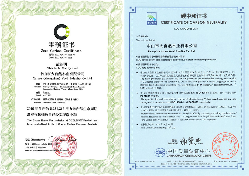 大自然家居始終堅持綠色低碳發(fā)展戰(zhàn)略。2021年9月14日,中國質量認證中心(CQC)向大自然家居頒發(fā)《碳中和證書》,標志著大自然家居成為行業(yè)首個實現碳中和的“燈塔”企業(yè)。早在2010年就推出了大自然“零碳”地板,通過采取改良生產工藝、優(yōu)化物流布局、減少包裝材料等措施,實現生產過程碳排放量的控制與降低,獲得國際零碳專業(yè)委員會“碳中和”認證,同年鋪進了中國第一座零碳排放公共建筑——上海世博會零碳館。